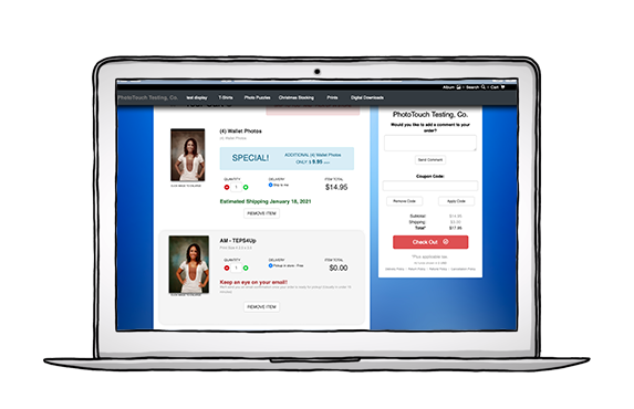 We offer a full-featured shopping cart, and digital download redemption site that allows you to sell your photos and personalized photo merchandise online and quickly delivery customer's digital images from onsite or online!